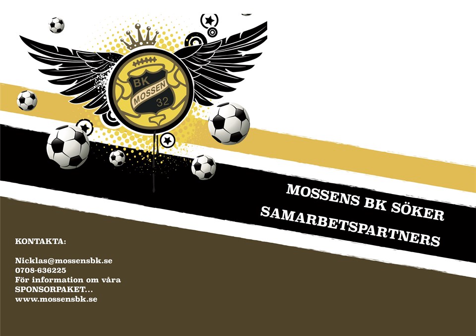 Säsongen 2017 spelar Mossens BKs herrar återigen i div 4 efter sin efterlängtade serieseger förra säsongen. Våra damer spelar kvar i div 1 men byter till Div 1 Mellersta Götaland. Sen har vi stora ungdomskullar både flickor och pojkar. Allt från de nyaste lagen P10 och F10/11 till våra äldsta U16 och F15. Klubben har ca 500 medlemmar varav ca 350 spelare. Inför säsongen 2017 söker vi sponsorer och samarbetspartners för att utveckla vår verksamhet. Vi vänder oss till företag och individer i vårt närområde (Guldheden, Johanneberg, Landala, Centrum, Krokslätt mm) men också till andra företag och individer som är intresserade av att stötta oss och synas tillsammans med oss. Kanske känner ni någon som spelar i klubben, kanske har ni spelat här tidigare eller kanske gillar ni fotboll i allmänhet och då dam- och ungdomsfotboll i synnerhet. Inför 2017 har vi tecknat ett samarbetsavtal med en ny leverantör av sportprodukter och tillsammans med STADIUM och ADIDAS kommer vi ta fram nya matchtröjor till samtliga våra lag. Detta ger en unik möjlighet till exponering de kommande 3-4 åren för våra gamla och nya samarbetspartners. Är ni intresserade så kontakta Nicklas Kartengren, ordförande. Nicklas@mossensbk.se eller 0708-636225. Ladda ner beskrivning av våra Sponsors-paket här. A-lag Herrar 18 jan 2017 0kommentarer