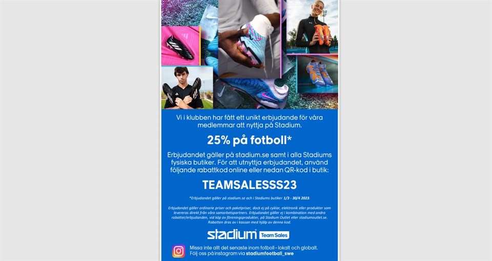 Hejsan! Nu finns bollar, västar mm i andra omklädningsrummet till höger på Älvsbacka. Det är inte sorterat per lag utan varje lag får hämta OCH MÄRKA det man behöver. Saknas nåt så hör man av sig. Kläder finns också där för utprovning och beställning. Som ifjol görs det via Stadiums webbplats. T o m maj har vi 25% rabatt på bla fotbollsskor. Se bild. Nya ledare samt ledare som fick nya kläder för 2-3 år sedan eller behöver nytt av annan anledning kan kila in här: MSK ledarkollektion Träningsjackan Academy 23 trk jkt eller Academy 23 drill topp ska ledare ha. Man får även träningsbyxorna som är till. Vill man ha annat plagg istället för ungefär samma värde så går det bra. :) Fotbollsledare 6 apr 2023 0kommentarer