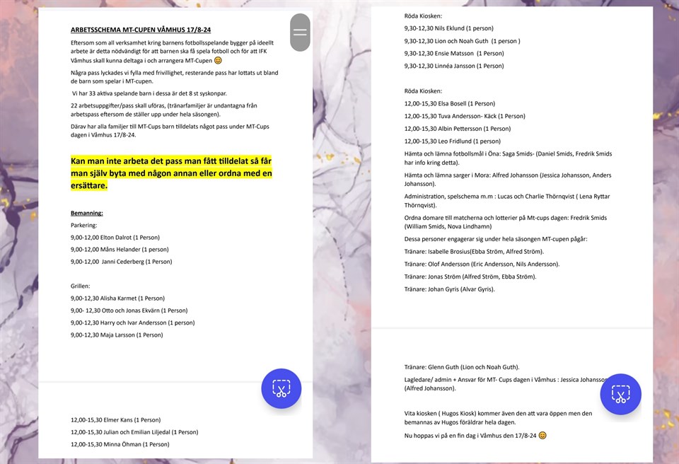 Hej! Sitter just nu och gör arbetsschema för MT-CUPen 2024. Är det någon som vill ta på sig arbetspass frivilligt? Pass att fylla är: Parkering 9.00-12.00 3 personer Grill 9:30-12.30 5 personer Grill 12:00-15:30 3 personer Kiosk 9.00-12.30 4 personer Kiosk 12:00-15:30 4 personer Jag kommer att fördela arbetspassen mellan barnen (föräldrar) som spelar i MT-Cupen. Men om någon redan nu vet med sig att de kan ta ett pass (och om det är fler personer från en familj som vill jobba) så får ni gärna kommentera här under så vet jag vad som behövs lottas. MT-Cupen P, F 16-17 17 jul 2024 0kommentarer