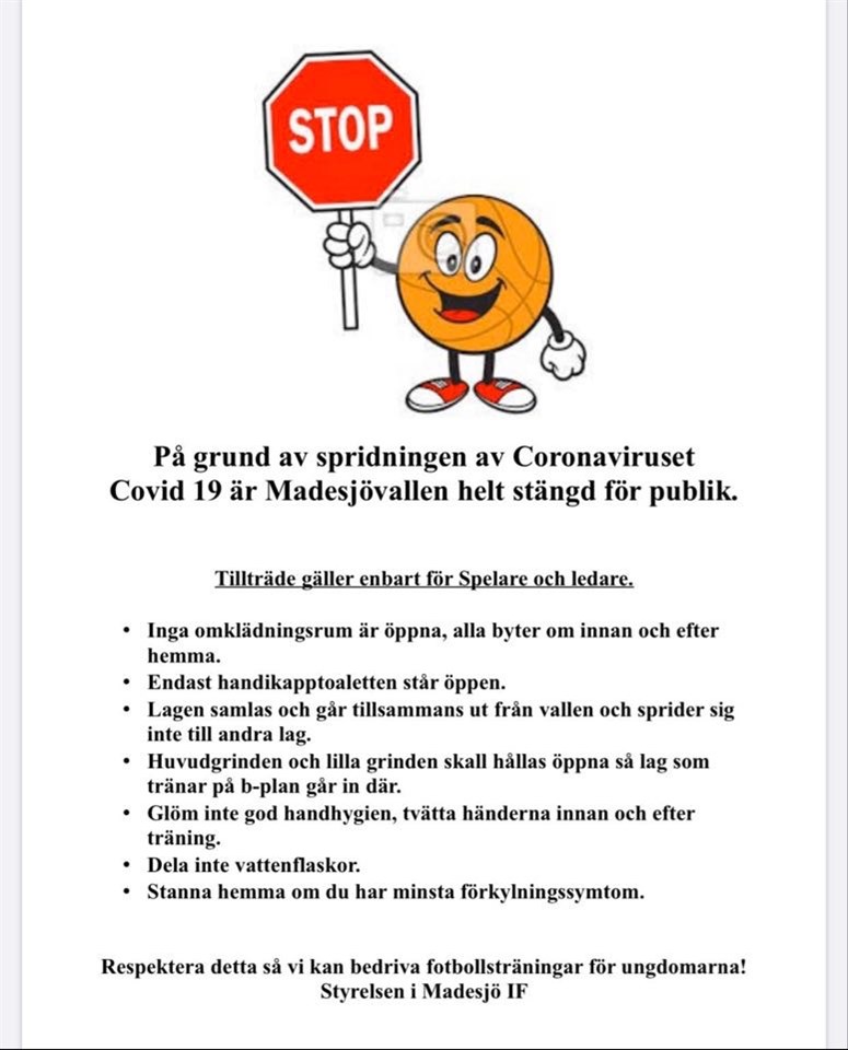 Följande lapp finns vid ingångarna av Madesjövallen. Tillsamman hjälps vi åt att inte sprida smittan vidare och hjälper även våra ledare att kunna bedriva träningar för våra ungdomar. Madesjö IF 21 apr 2020 0kommentarer