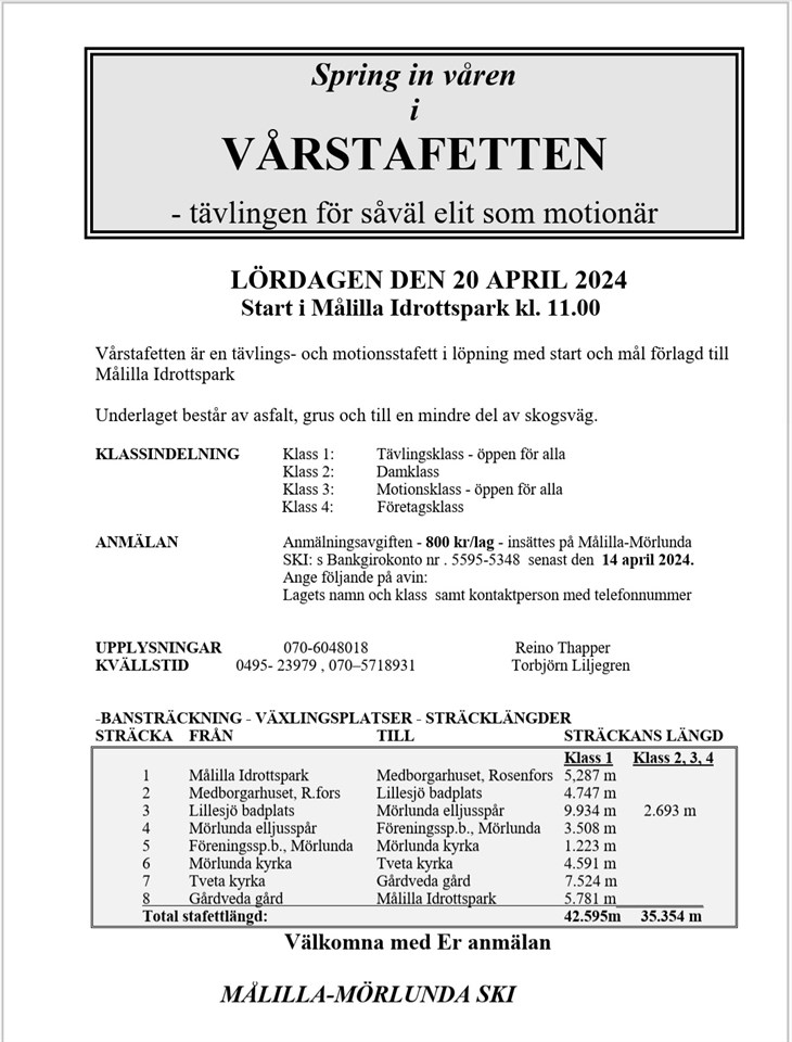 Nu är det dags för Vårstafetten. På hemsidan under fliken mer och dokument så finns inbjudan till stafetten. Samla kompisgänget, företaget eller idrottsklubben och var med på en rolig dag. Välkomna med er anmälan Målilla-Mörlunda SKI 24 jan 2024 0kommentarer