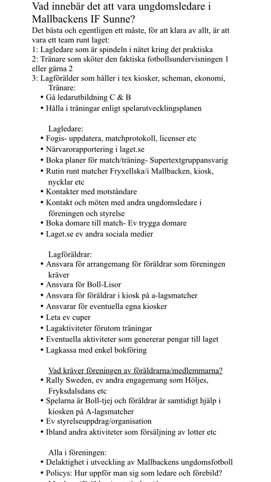 Hej. Skickar med info om arbetsuppgifter som behöver göras under en säsong. Läs igenom detta och fundera på vad ni kan tänka er hjälpa till med under säsongen. På mötet kommer en del av dessa uppgifter fördelas mellan föräldrar. Exempel på uppgifter: Boka domare, fixa bollisor, kiosk, lagmamma vid matcher, mm. Om dom som inte kan vara med på mötet skriver vilken uppgift man kan tänka sig, så vore det bra. Kolla igenom så syns vi på tisdag 17:00 i Sporthallen.