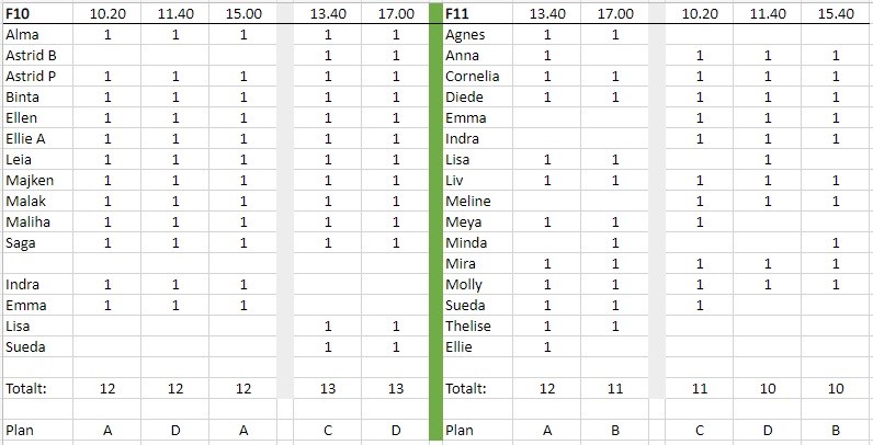 Hej! Ber om ursäkt för att det dröjt, men här kommer information inför helgens roliga cupäventyr på Tallmovallen, Östra Deje. Det har varit lite att pussla med för att kunna få alla tjejer att spela de matcher som de finns tillgängliga, lagen ser ni i bilden och står det en etta vid ditt barns namn är hon uttagen till just den matchen. Notera extra att Indra, Emma, Lisa och Sueda får spela med både F10 och F11, fast vid olika tillfällen, samt att Sueda och Lisa får spela med F11 en match var även på söndagen. Varför? Det är för att vi inte ska vara för få i F10, eller för många i F11. Samlingstiderna blir lite olika, men räkna med att ha din tjej på plats senast 45 minuter före dagens första match. Det ska finnas lunch att köpa på Tallmovallen så skicka med tjejerna en liten slant, alternativt något att äta. OBS, det är viktigt att de får i sig energi mellan matcherna, så packa gärna med en matsäck med frukt och dylikt. Övrigt: - För dem som vill bada finns det sådana möjligheter i Bergstjärn, ett stenkast från fotbollsplanerna. - Annars uppskattar vi om tjejerna vill börja byta om med varandra. Packa därför gärna med handduk och duschgrejor. - Torra kläder och ombyte är viktigt. Vi ska inte gå runt i eventuellt blöta eller svettiga tröjor och fotbollskläder, packa gärna med något extra par fotbollsstrumpor så att alla har extra ifall det skulle bli blött. - Jag har fått frågan om det, och det här är inte en cup där vi övernattar. Vi åker hem efter sista match på lördag och åker tillbaks sedan på söndag. Med tanke på bränslepriser, och inte minst miljön, vill jag slå ett extra slag för att samåka i den mån det går. Annars taggar vi till. Det ska bli väldigt roligt, det här och vi i ledarstaben ser mycket fram emot att få ta med tjejerna på cup!