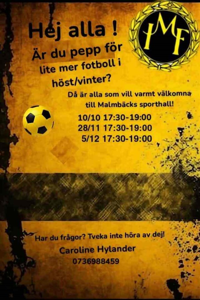 Klubben har bokat sporthallen för lite fredagsfotboll. Den kommer vara 1gång/månad tillsammans med fotbollstokiga ungdomar och ledare från lagen i Malmbäck. Så skriv upp i kalendern så ni inte missar något tillfälle ! Hälsningar Clara Fotboll F13-14 17 sep 2025 0kommentarer