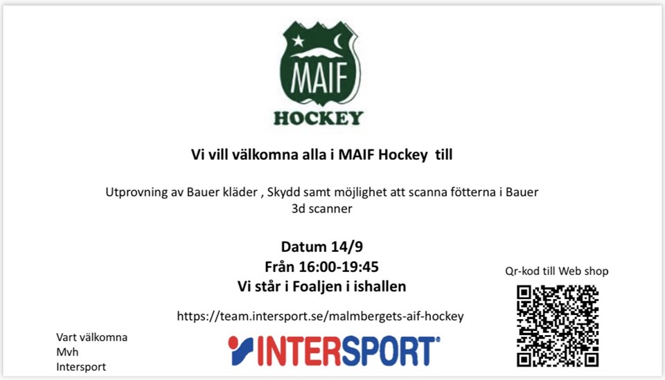 Intersport hockey kommer till ishallen tisdag 14/9 för utprovning. De har med sig scanner för fötter om man funder på vilken storlek på skridskor man behöver, de har med sig en hel del utrustning och kläder. De är bra på att hjälpa kring storekar och vad som kan tänkas behövas för varje åldersgrupp. De är på ishallen i foajen mellan 16:00-19:45 Glöm inte att registrera er på intersport och team Malmbergets AIF så får Maif hockey oxå en bonus för allt som handlas på Intersport oavsett om det är hockey eller annat. https://www.intersport.se/club-intersport/registrera/?team=malmbergets-aif-hockey