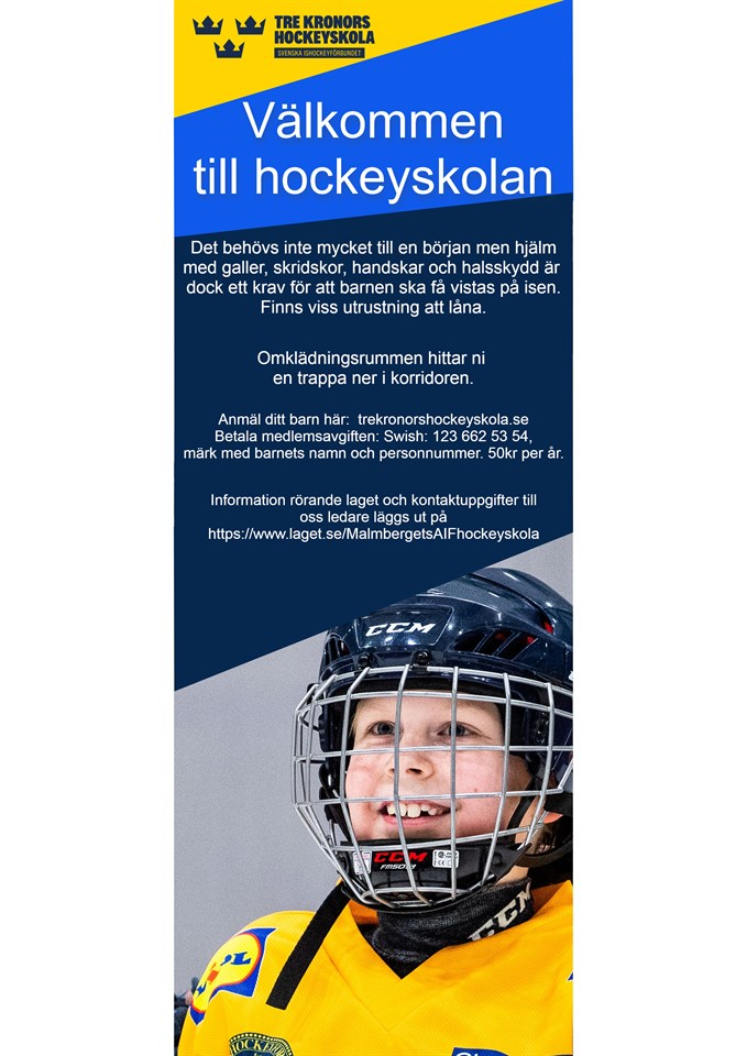 Hej allihopa :) Planerad start är tisdag 18:00-19:00 19/9. Vi kommer ha kvar samma tider som tidigare. Tisdagar 18:00-19:00 Söndagar 17:00-19:00 Äldrarna för hockeyskolan är -16, -17 och -18. Äldra barn är så klart välkomna för att prova på och sedan ta steget upp till sin rätta grupp när de är redo. Så fast hallen är öppen och den planerade tiden för hockeyskolan kan synas på diverse istidsscheman så är startdatum 19/9 kl 18:00 om ingen annan info ges via denna informationskanal. Passa gärna på att anmäla er via https://trekronorshockeyskola.se Välj Malmbergets AIF och skriv in våra blivande hockeyhjältar! Frågor och funderingar? Kontakta Marcus Karlsson på 073-0689781