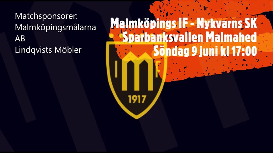 Imorgon söndag den 9 juni gästar Nykvarns SK Malmköping. Matchstart kl 17:00 Nykvarns SK är nykomlingar i serien och har hittills spelat in 2 poäng. I senaste matchen föll man hemma mot Katrineholms SK med 0 - 6. MIF studsade tillbaka efter förlusten mot Viljan, och besegrade Södertälje FF borta med 8 - 3. Inga matcher är lätta men en seger är väldigt viktig, så att man hakar på Viljan i serietoppen. Det blir en ändring i truppen jämfört med senast. Ahmed Mahamud ersätter Anton Scheikl. Truppen i sin helhet: Adam Wallström mv Lennart Johansson Lester Sarino Tobias Lindström Joel Wikelind Oskar Falk Sebastian Rombing Erik Gustafsson Johan Wallström Niklas Pettersson Filip Nilsson Ahmed Mahamud Sebastian Ravnborg Martin Törnhjelm Filip Broström Christoffer Axner Matchsponsorer: Malmköpings Målarna AB och Lindqvists Möbler