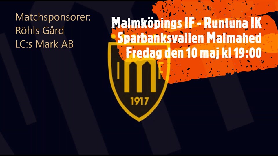 Dags för match igen! Imorgon fredag spelas omgång 4. Malmköpings IF gästas då av Runtuna IK. Matchstart kl 19:00. Runtuna har börjat serien piggt! Två segrar och en förlust. Senast blev det en 2 - 0 seger hemma på Runavallen mot Katrineholms SK. Förra säsongen match mellan lagen i Malmköping slutade 3 - 3. Alla RIK:s mål kommer efter hörnor, så det är något vi får se upp med. MIF har börjat serien med tre raka segrar. Så varför inte en fjärde imorgon! Det blir ett par ändringar i truppen jämfört med senaste matchen mot Oxelösunds IK. Sebastian Rombing och Jimmy Carlsson återkommer. Utgår gör Gustav Falk och Edvin Hyström. Truppen i sin helhet: Adam Wallström mv Jimmy Carlsson mv Mohammad Amiri Christoffer Axner Daniel Einarsson Oskar Falk Erik Gustafsson Lennart Johansson Filip Nilsson Sebastian Rombing Niklas Pettersson Sebastian Ravnborg Lester Sarino Anton Scheikl Johan Wallström Joel Wikelind Matchsponsorer: Röhls Gård och LC:s Mark AB