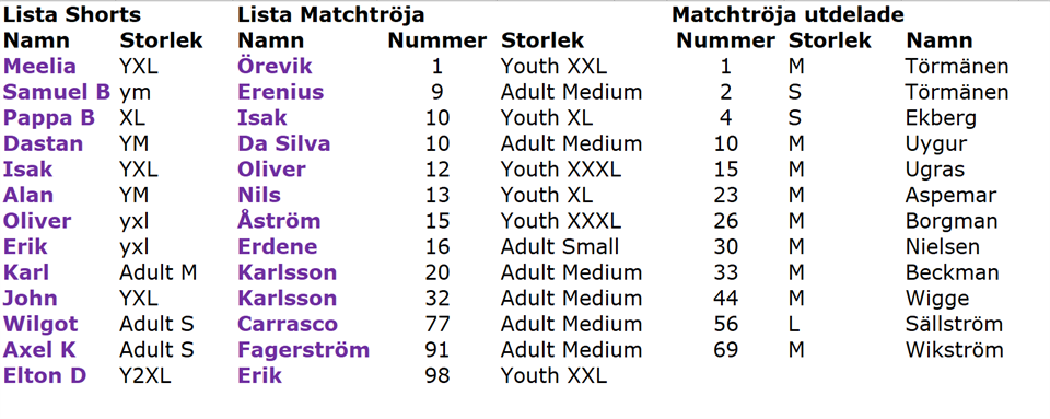 Hej, I bilden är listan på beställda shorts och matchtröjor. Jag kommer ha med dem delvis idag och delvis på onsdag. För er som inte betalt. Shorts = 200 kr. Matchtröja = 500 kr. Swisha till 123 6173025