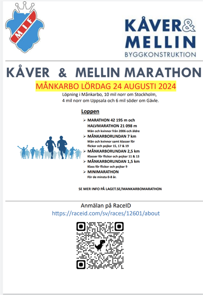 Hej! Vi har nu fått klart med en ny huvudsponsor så nu välkomnar vi er till Kåver & Mellin Marathon i Månkarbo. Här finns länk till deras hemsida KÅVER & MELLIN KONSTRUKTION Marathon, halvmarathon, Månkarborundan och Mimimarathon går av stapeln den 24 augusti. Inbjudan finns här Funkar inte länken gå till dokument och flik 2024 i menyn ovan. En nyhet för året är att anmälan och betalning sker via RaceID. Här finns en länk till loppet på RaceID: Länk till anmälan på Race ID Här är oxå adressen till loppet på RaceID: https://raceid.com/sv/races/12601/about Varmt Välkomna till Månkarbo.