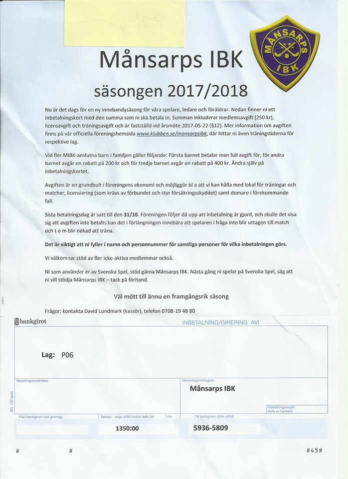 Hej Vi har och vi kommer att dela ut inbetalningskort kommande träningar. Bifogat till denna nyhet finns en kopia på inbetalningskort (i fall orginalet tappas bort). Medlemsavgiften för P06 är i år 1350kr mer info om medlemsavgiften finns på inbetalningskortet. Sista inbetalningsdag är 31/10 Har ni några frågor utöver det som står på inbetalningskortet kontakta David Lundmark(kassör), telefon 0708-19 48 80 /Tobias Philip P06 / JAS 9 okt 2017 0kommentarer