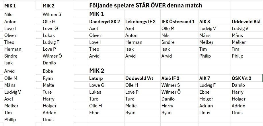 Vi har två lag anmälda till Select cup i år. Båda lagen spelar alla sina matcher på Ekängs IPs konstgräs. Då vi har 32 barn som tackat ja har vi valt att dela upp så att varje barn står över 1-2 matcher, för att när det väl är match få så mycket speltid som möjligt. Matchtiden är 2x15 minuter. Nedan hittar ni länk till spelschema och i infogad bild lagindelningen. Observera att listan till höger i bilden är när ditt barn STÅR ÖVER och inte spelar, övriga matcher är ni kallade till. Vi samlas 30 minuter innan varje match i nära anslutning till den plan vi spelar på. Tänk på att det kan vara väldigt svårt att hitta parkeringsplats denna helg. Spelschema MIK 1 Spelschema MIK 2