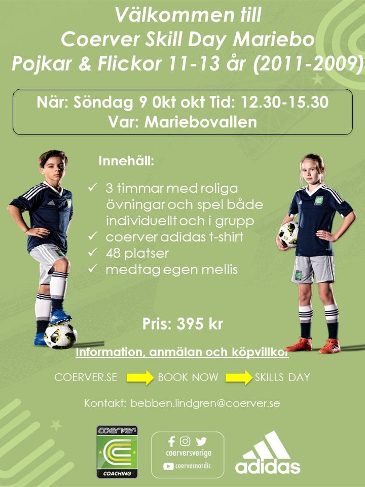 Söndag 9 oktober så finns det fortarande platser kvar till Coerver Coachning. 3 timmar med roliga övningar och spel både individuellt och i grupp Coerver adidas t-shirt Mvh Ungdomssektionen P-10 26 sep 2022 0kommentarer