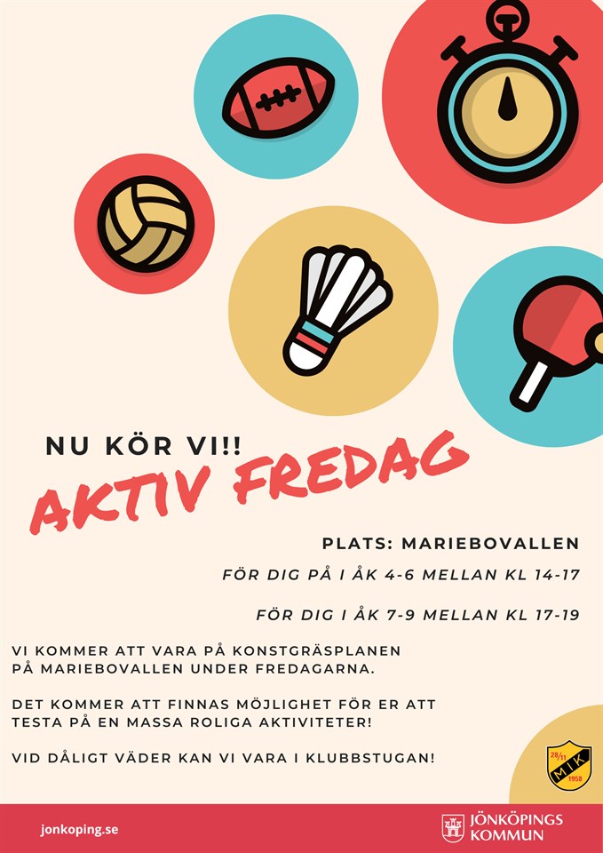NU KÖR VI !! Aktiv fredag från 16 september på mariebovallen. Åk 4 - 6 klockan 14:00 - 17:00 Åk 7 - 9 klockan 17:00 - 19:00 Kommer att finnas möjligheter för att testa på en massa roliga aktiviteter. Detta är ett samarbete mellan Mariebo IK och Jönköpings Kommun. VÄLKOMNA!