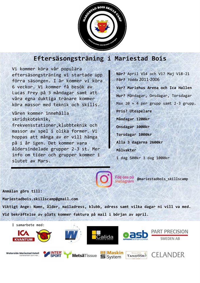 Chans till eftersäsongsträning. All information finns i bilden Följ gärna @mariestadbois_skillscamp på instagram A-pojk 4 feb 2022 0kommentarer