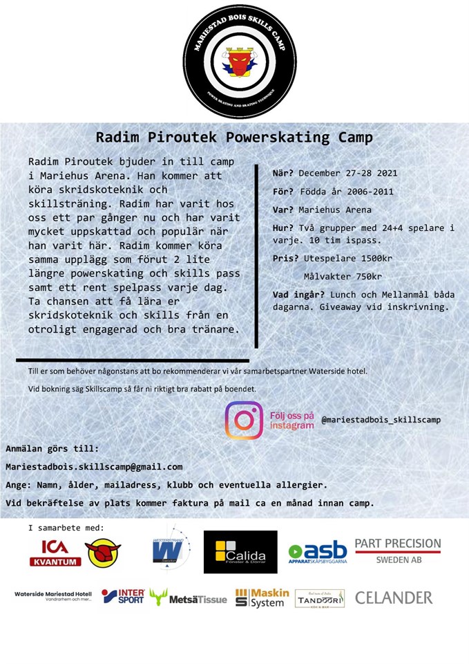 Radim Piroutek Powerskating Camp för spelare födda 2006-2011 den 27-28/12 i Mariehus Arena. Pris: 1500 kr för utespelare, 750 kr för målvakter Anmäl till skillscamp@gmail.com Ange namn, ålder, mailadress, klubb och ev. allergier. Vid bekräftelse av plats kommer faktura på mail ca en månad innan campen. A-pojk 8 sep 2021 0kommentarer
