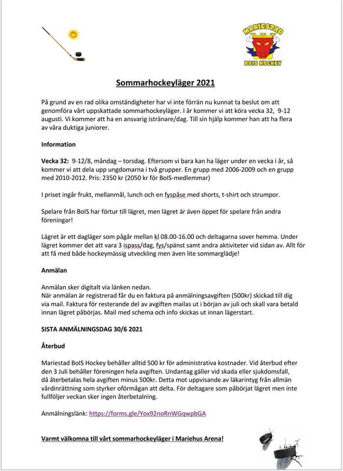 På grund av en rad olika omständigheter har vi inte förrän nu kunnat ta beslut om att genomföra vårt uppskattade sommarhockeyläger. I år kommer vi att köra vecka 32, 9-12 augusti. Vi kommer att ha en ansvarig tränare/dag. Till sin hjälp kommer han att ha flera av våra duktiga juniorer. Information Vecka 32: 9-12/8, måndag-torsdag. Eftersom vi bara kan ha läger under en vecka i år, så kommer vi att dela upp ungdomarna i två grupper. En grupp medd 2006-2009 och en grupp med 2010-2012. Pris: 2350 kr (2050 för BoIS-medlemmar). I priset ingår frukt, mellanmål, lunch och en fyspåse med shorts, t-shirt och strumpor. Spelare från BoIS har förtur till lägret, men lägret är öppet för spelare från andra föreningar! Lägret är ett dagsläger som pågår mellan kl. 08.00-16.00 och deltagarna sover hemma. Under lägret kommer det att vara 3 ispass/dag, fys/spänst samt andra aktiviteter vid sidan av. Allt för att få med både hockeymässig utveckling men även lite sommarglädje! Anmälan Anmälan sker digitalt via länken nedan. När anmälan är registrerad får du en faktura på anmälningsavgiften (500 kr) skickad till dig via mail. Fakturan för resterande del av avgiften mailas ut i början av juli och skall vara betald innan lägret påbörjas. Mail med schema och info skickas ut innan lägerstart. SISTA ANMÄLNINGSDAG 30/6 2021 Återbud Mariestad BoIS Hockey behåller alltid 500 kr för administrativa kostnader. Vid återbud efter den 3 juli behåller klubben hela avgiften. Undantag gäller skada eller sjukdomsfall, då återbetalas hela avgiften minus 500 kr. Detta mot uppvisande av läkarintyg från allmän vårdinrättning som styrker oförmågan att delta. För deltagare som påbörjat lägret men inte fullföljer veckan sker ingen återbetalning. Anmälningslänk: https://docs.google.com/forms/d/e/1FAIpQLSeqRy1mfxtt57d_J2KEuUMryburgVBtxb80Q1xSuPUMhFlGQQ/viewform Varmt välkomna till vårt sommarhockeyläger i Mariehus Arena!