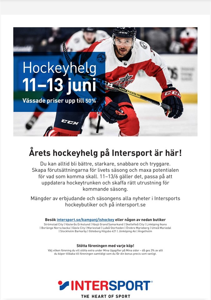 I samarbete med vår partner Intersport är det nu dags för årets hockeyhelg! Uppdatera trunken för årets säsong och du är samtidigt med och stöttar vår förening, för du har väl valt Mariestad BoIS Hockey som förening att stötta extra på "Mina sidor" på intersport.se?