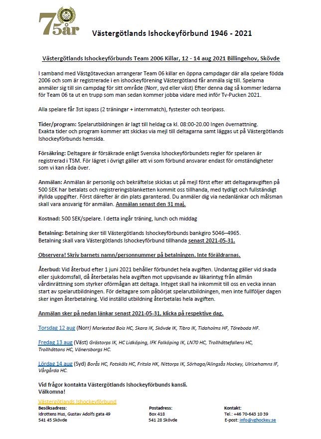 Västergötlands Ishockeyförbunds Team 2006 Killar, 12 - 14 aug 2021 Billingehov, Skövde I samband med Västgötaveckan arrangerar Team 06 killar en öppna campdagar där alla spelare födda 2006 och som är registrerade i en ishockeyförening Västergötland får anmäla sig till. Spelarna anmäler sig till sin campdag för sitt område (Norr, syd eller väst) Efter denna dag så kommer ledarna för Team 06 ta ut en trupp som man sedan kommer jobba vidare med inför Tv-Pucken 2021. Alla spelare får 3st ispass (2 träningar + internmatch), fystester och teoripass. Tider/program: Spelarutbildningen är lagt till heldag ca kl. 08:00-20.00 Ingen övernattning. Exakta tider och program kommer att skickas via mejl till deltagarna samt läggas ut på Västergötlands Ishockeyförbunds hemsida. Anmälan: Anmälan är personlig och bekräftelse skickas ut på mejl först efter att deltagaravgiften på 500 SEK har betalats och registreringsblanketten kommit oss tillhanda, med tydligt och fullständigt ifyllda uppgifter. Först därefter är din plats garanterad. Du anmäler dig via nedanlänkar och målsman skall vara ansvarig för anmälan. Anmälan senast den 31 maj. Kostnad: 500 SEK/spelare. I detta ingår träning, lunch och middag