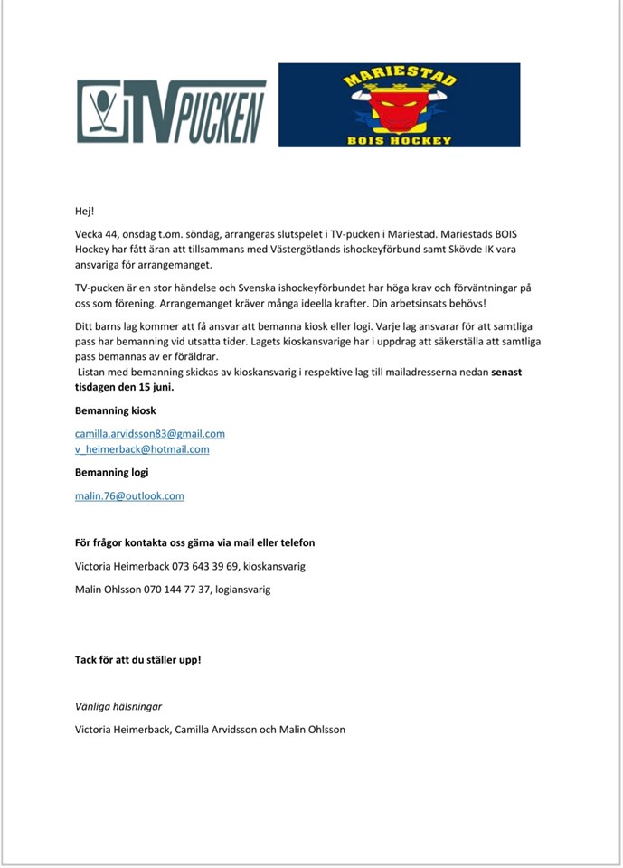 Hej! Vecka 44, onsdag t.om. söndag, arrangeras slutspelet i TV-pucken i Mariestad. Mariestads BOIS Hockey har fått äran att tillsammans med Västergötlands ishockeyförbund samt Skövde IK vara ansvariga för arrangemanget. TV-pucken är en stor händelse och Svenska ishockeyförbundet har höga krav och förväntningar på oss som förening. Arrangemanget kräver många ideella krafter. Din arbetsinsats behövs! Ditt barns lag kommer att få ansvar att bemanna kiosk eller logi. Varje lag ansvarar för att samtliga pass har bemanning vid utsatta tider. Lagets kioskansvarige har i uppdrag att säkerställa att samtliga pass bemannas av er föräldrar. Listan med bemanning skickas av kioskansvarig i respektive lag till mailadresserna nedan senast tisdagen den 15 juni. Bemanning kiosk camilla.arvidsson83@gmail.com v_heimerback@hotmail.com Bemanning logi malin.76@outlook.com För frågor kontakta oss gärna via mail eller telefon Victoria Heimerback 073 643 39 69, kioskansvarig Malin Ohlsson 070 144 77 37, logiansvarig Tack för att du ställer upp! Vänliga hälsningar Victoria Heimerback, Camilla Arvidsson och Malin Ohlsson