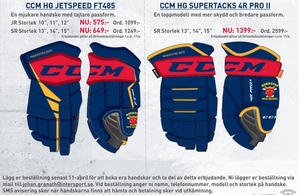 Nu kan ni beställa den nya och grymt snygga BOIS-Handsken inför säsongen 2021/2022. En unik produktion av två handskar från CCM, speciellt framtagen för alla BOISARE. Ni beställer era handskar via mail till johan.granath@intersport.se. I er beställning skickar ni Namn, Telefonnummer samt vilken handske och storlek ni önskar. Erbjudandet gäller t.o.m. 11 april. Så passa på att skicka in er beställning så snart som möjligt för att ta del av erbjudandet. Handskarna betalas vid uthämtning i butiken lagom till säsongsstart. Vid frågor så kontaktar ni Intersport Mariestad 0501-10919, eller kika in i butiken så hjälper personalen er där. A-pojk 2 apr 2021 0kommentarer