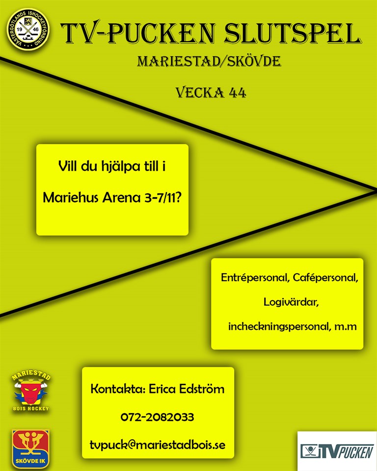 Vill du hjälpa till under TV-pucksveckan? Tv-puckens slutspel för både tjejer och killar kommer att spelas i Mariestad/Skövde under vecka 44. Vi söker er som vill hjälpa till i Mariestad en dag eller flera dagar, ett pass eller flera pass. Ring, smsa eller maila till Erica Edström om du kan tänka dig att hjälpa till eller om du har några frågor. Kontakt uppgifter finns i bilden om du klickar upp hela A-pojk 15 apr 2021 0kommentarer