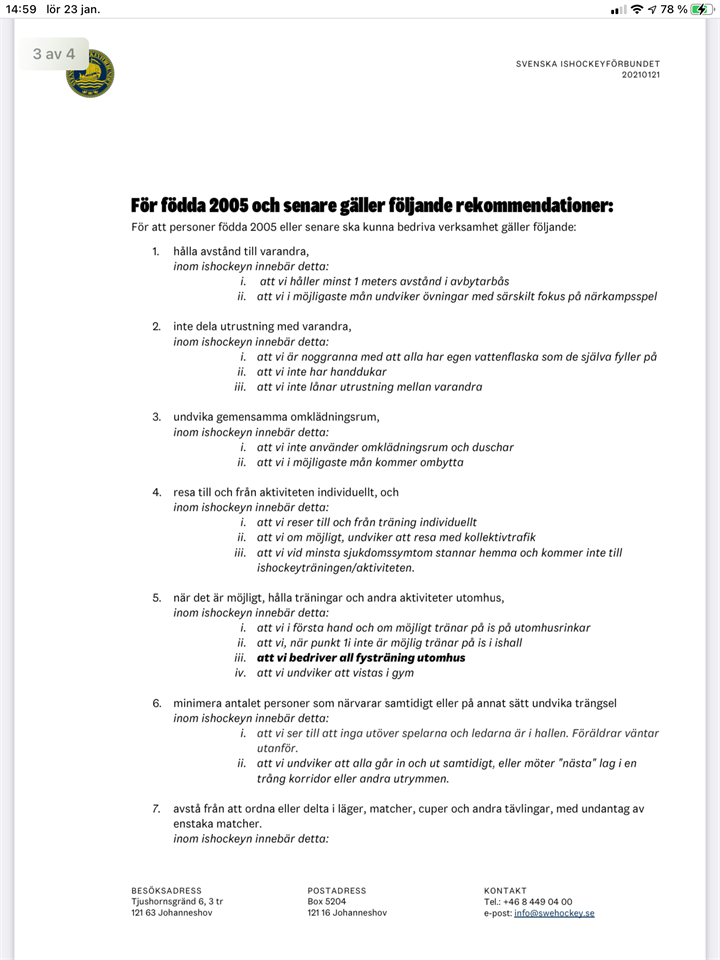 Glädjande nog kan spelare födda 2005 och senare börja träna på is från och med måndag 25/1. I bifogar bild kan ni se vad som gäller vid träningar. (Kan ni inte se hela bilden med 7 punkter så klicka upp bilden i stor storlek). Dessa 7 punkter är fastställda av Svenska Ishockeyförbundet och utskickat till föreningarna 20210121. Jonny Odhner Klubbchef A-pojk 23 jan 2021 0kommentarer