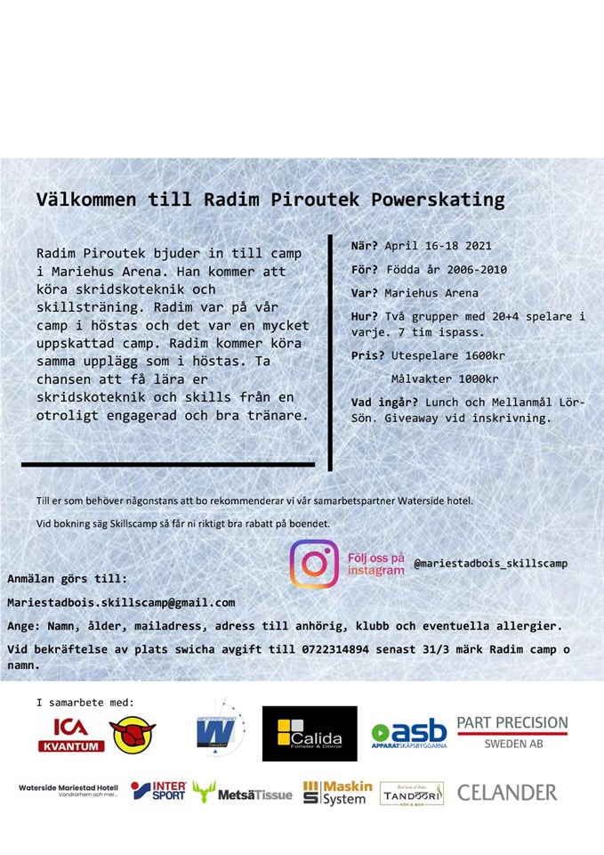 Ta chansen att vara med på Radim Piroutek Powerskating den 16-18/4-21. Spelare födda 2006-2010 kan delta. All information finns på bilden A-pojk 30 jan 2021 0kommentarer