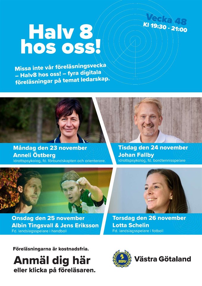 Halv8 hos oss! – en digital föreläsningsvecka på temat det stärkta ledarskapet. 23/11 Anneli Östberg – ”Ledarskap som skapar kö till föreningsstyrelsen”. Anneli har bland annat varit förbundskapten inom orienteringen i 9 år. Mer info och anmälan 24/11 Johan Fallby – ”Ledarskap i föräldra- och tränarrollen”. Johan är idrottspsykologisk rådgivare med erfarenhet från Svenska Olympiska Kommittén och Svenska Fotbollförbundet Mer info och anmälan 25/11 Albin Tingsvall & Jens Eriksson – ”Ledarskap för hållbar elit- och breddidrott för barn och vuxna”. Albin och Jens är tidigare elithandbollsspelare. Albin har skrivit boken Allt jag förlorade genom att vinna. Mer info och anmälan 26/11 Lotta Schelin – ”Ledarskap – mina olika erfarenheter i mitt spelarskap”. Lotta har bland annat tre Champions League-titlar i fotboll och är en fantastisk förebild. Hon släppte även sin första bok precis. Mer info och anmälan RF-SISU Västra Götaland A-pojk 20 nov 2020 0kommentarer