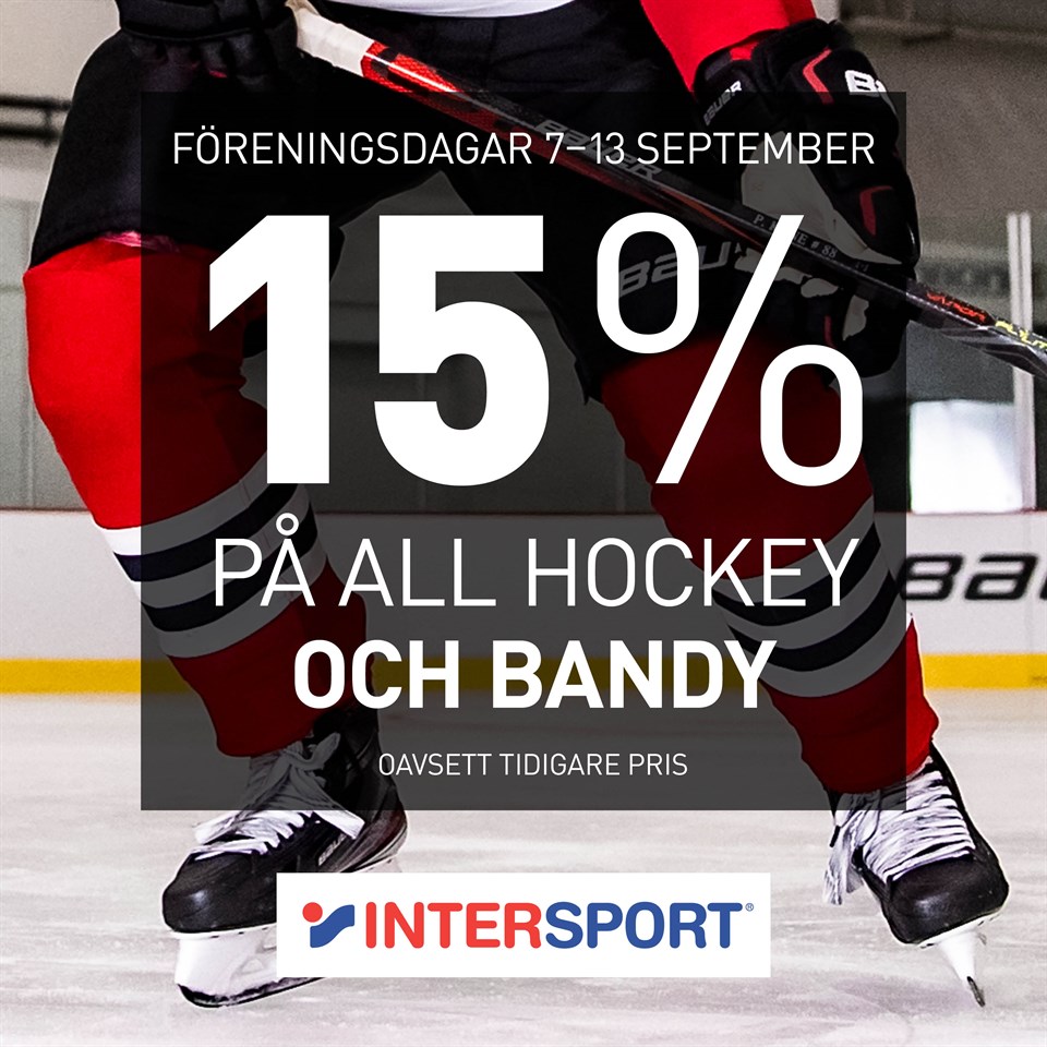 Den 7–13 september är det föreningsdagar hos vår samarbetspartner Intersport och ni får en exklusiv rabatt om 15% på all hockey och bandy, oavsett tidigare pris. Passa på att inhandla det senaste inom hockey och bandy inför en ny härlig säsong på isen. Dessutom får du som medlem 25% på allt i butiken!* Visa upp detta inlägg i butiken eller använd rabattkoden FÖRENING25 på intersport.se. *Erbjudandet gäller 7–13 september på ord.pris, dock ej på presentkort, hockey, bandy, elektronik, cyklar, träningsmaskiner, studsmattor, Hövding, Thule, golf, föreningskläder/teamkläder eller beställningsvaror. #intersport #foreningsdagar