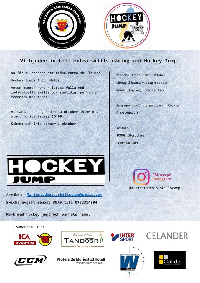 Inbjudan till extra skillsträning med Hockey Jump! All information finns på bilden, bland annat datum, pris och hur du anmäler dig. Gäller åldersgrupperna 2006-2008