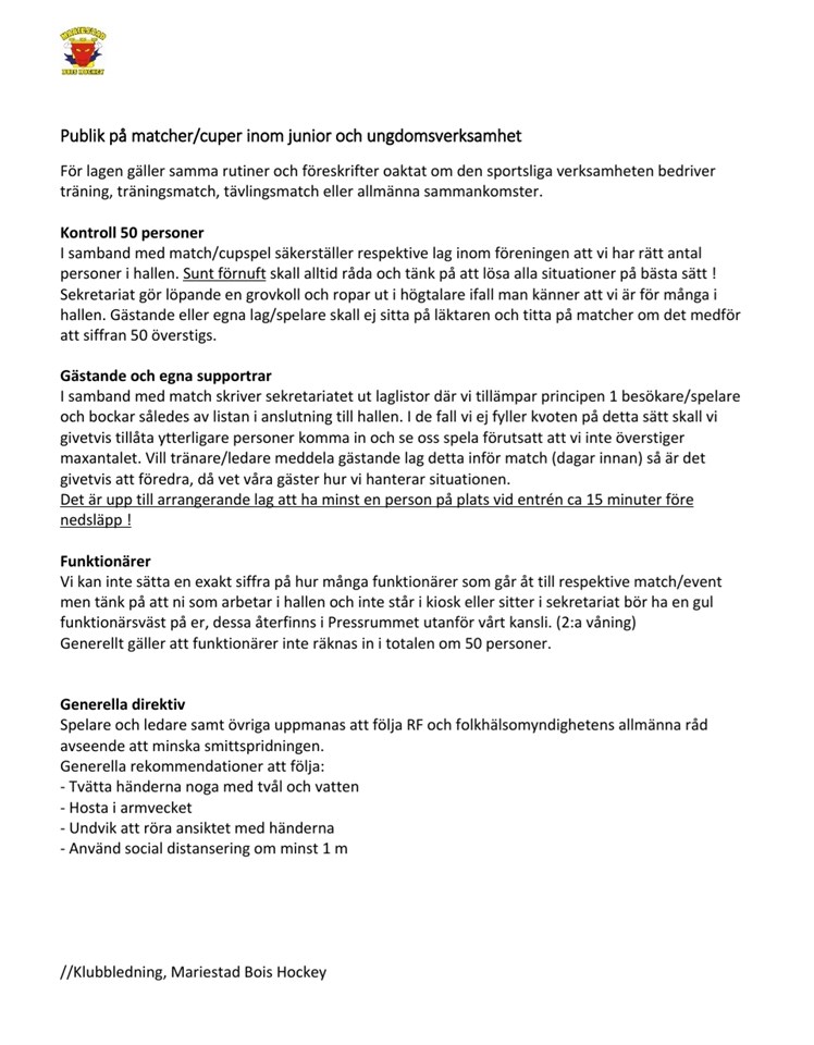 Vår önskan är att alla spelare och ledare vid minsta tecken på förkylningssymptom kontaktar sin vårdcentral för att göra ett covid-19 test (PCR-test). Mariestad BoIS Hockeys styrelse och klubbledning