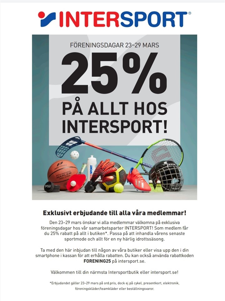 Föreningsdagar hos vår samarbetspartner INTERSPORT! Den 23–29 mars får alla våra medlemmar 25% på allt! A-pojk 23 mar 2020 0kommentarer