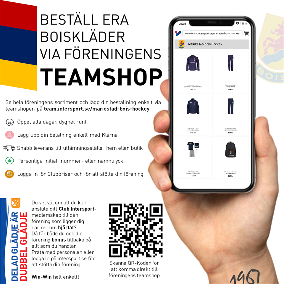 Ni har väl inte missat att ni kan beställa era föreningskläder i Bois Hockeys teamshop på https://team.intersport.se/mariestad-bois-hockey Där hittar ni allt från overaller till träningskläder och väskor med Boislogga, tryckt och färdigt. Leveranstid ca 4-8 dagar. Kläderna finns att prova hos Intersport Mariestad, önskar ni hjälp så pratar ni med personalen i butiken så guidar dem er rätt. Provkläder kommer även att finnas i Intersports Pop Up Store i entrén i Mariehus Arena i samband med A-lagets hemmapremiär mot Forshaga nu på lördag 30/9. Kika in i Teamshopen nu och lägg er beställning snabbt och smidigt