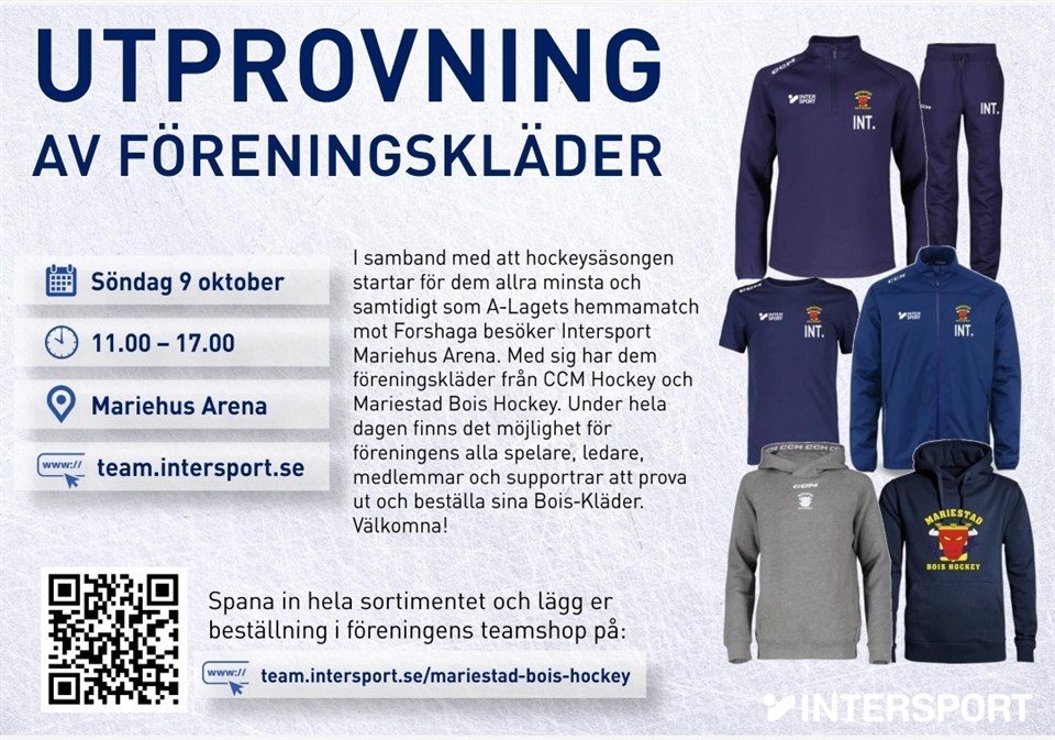 I samband med att hockeysäsongen startar för de allra minsta och samtidigt som A-Lagets hemmamatch mot Forshaga 9 oktober (kl. 11-17) får vi besök av Intersport Mariestad i Mariehus Arena. Med sig har de föreningskläder från CCM Hockey och Mariestad BoIS Hockey. Under hela dagen finns det möjlighet för föreningens alla spelare, ledare, medlemmar och supportrar att prova ut och beställa sina BoIS-kläder. Välkomna!