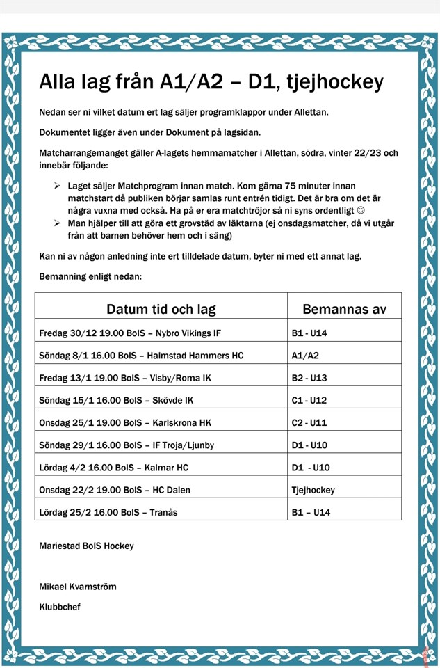 Här är schemat för när lagen säljer programklappor vid a-lagets matcher i Allettan. (klicka på bilden för att se hela)