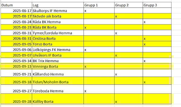 Här kommer en ny gruppindelning för höstens matcher, vi har valt att göra nya grupper för att få en god lagsammanhållning och att alla ska få möjlighet att spela med alla. Vi kommer skicka kallelse till respektive grupp ungefär 1 vecka innan med sista svarstid 4 dagar innan match.