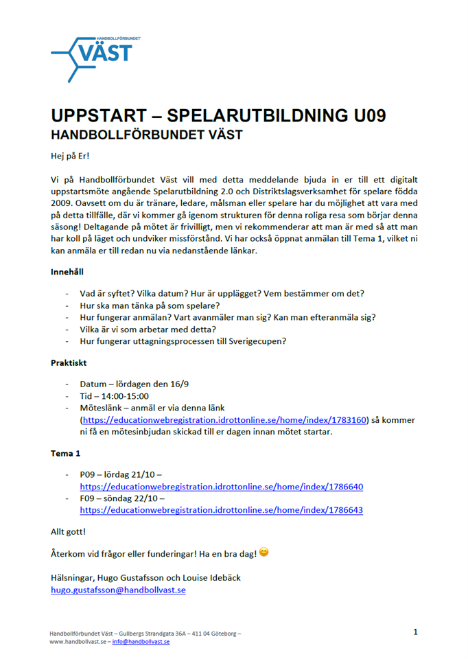 Handbollförbundet Väst bjuder in till ett digitalt uppstartsmöte angående Spelarutbildning 2.0 och Distriktslagsverksamhet för spelare födda 2009. Spelarutbildning 2.0 är olika tillfällen då man tränar med tjejer från andra klubbar och med tränare som oftast har en högre utbildning inom träning. Spelarutbildningen är starten på att kunna bli uttagen till förbundskapten och framtida rikslag. Tränare, ledare, målsman och spelare har möjlighet att vara med på detta tillfälle, där de kommer gå igenom strukturen för utbildningen. På mötet kommer bland annat svar ges på: - Vad är syftet och hur är upplägget? - Hur ska man tänka på som spelare? - Hur fungerar anmälan? Mötet hålls lördagen den 16/9 kl 14-15. Mer information finns i bifogad injudan och anmälan sker direkt till Handbollförbundet Väst via denna länk: https://educationwebregistration.idrottonline.se/home/index/1783160 F16/15 (2009/2010) 16 aug 2023 0kommentarer