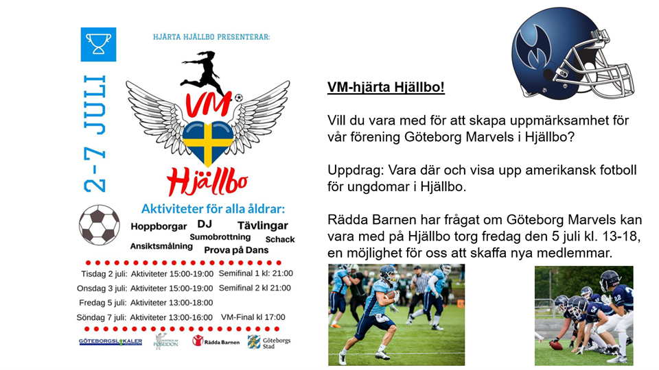 Kan och vill du vara med för att skapa uppmärksamhet för vår förening Göteborg Marvels i Hjällbo? Frågan går ut till U13, U15, U17, U19, Damerna och Herrarna. Uppdrag: Vara där och visa upp amerikansk fotboll för ungdomar i Hjällbo. Rädda Barnen har frågat om Göteborg Marvels kan vara med på Hjällbo torg fredag den 5 juli kl. 13-18, en möjlighet för oss att skaffa nya medlemmar. Mer Information finns på deras facebook, se länk. Anmäl dig i kallelsen på Laget.se. Mer information kommer. Efter förra årets succé är det dags igen: VM hjärta Hjällbo. Semifinalerna och finalen i fotbolls-VM för damer kommer visas på storbildsskärm mitt på torget i Hjällbo och det blir aktiviteter för hela familjen. Förhoppningen är att både barnfamiljer, unga vuxna och äldre ska samlas och ha trevligt på torget. Alla är välkomna - arrangemanget är gratis PROGRAM Alla aktiviteter och storbildsvisningen sker mitt på Hjällbo Torg Tis 2/7 aktiviteter kl 15-20, semifinal 1. Matchen startar kl 21. Ons 3/7 aktiviteter kl 15-20, semifinal 2. Matchen startar kl 21. Tor 4/7 Inga aktiviteter Fre 5/7 aktiviteter kl 13-18 (ingen VM-match). Göteborg Marvels visar amerikansk fotboll Lör 6/6 Inga aktiviteter. Söndag 7/7 aktiviteter kl 13-16, VM-finalen startar kl 17. BAKGRUND I samband med evenemanget ”VM Hjärta Hjällbo” som genomfördes under sommaren 2018 utvecklades en samverkansgrupp vars främsta syfte var att samarbeta för ett enat Hjällbo med fokus på trivsel, trygghet, gemenskap och delaktighet. Evenemanget erhöll mycket positiv respons från boende, föreningar, företagare samt representanter från stadsdelen. Aktörer och boende i Hjällbo visade ett stort engagemang och en vilja att utveckla områdesarbetet för att skapa förutsättningar för ett inkluderande klimat med fokus på de goda krafter som finns i området. Samverkansgruppen har fortsatt att verka på en lokalnivå och önskar vidareutveckla ”Hjärta Hjällbo” idén ytterligare som en del av områdesarbetet. Detta för att inkludera och öka boende, barn och ungas inflytande i stadsdelen. VM Hjärta Hjällbo arrangeras av Sdf Angered, Poseidon, Göteborgs Lokaler och Rädda Barnen i samverkan med lokala föreningar, handlare, Västra Götalands Idrottsförbund och Hyresgästföreningen.