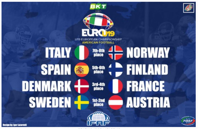 Efter semifinaler och placeringsmatcherna under torsdagen vet vi hur finaldagen den 4 augusti ser ut när junior-EM för herrar i Italien ska avgöras – och förstås med finalen mellan Sverige-Österrike som den stora höjdpunkten. Matcherna på finaldagen i Bologna är: Final Sverige-Österrike Söndagen den 4 augusti kl. 21:00, Arcoveggio Stadium. Sverige var förstarankade inför turneringen och är regerande Europamästare, och man visade varför när man slog Frankrike med 7-0 i semifinalen. I finalen ställs man mot Österrike, ett lag som många menar borde ha varit förstarankade inför turneringen och som inte har förlorat en landskamp med europeiskt motstånd sedan 2008. De har också vunnit sina två spelade matcher i turneringen med imponerande 61-7 och 45-6. En tuff utmaning väntar för Sverige i en final där Österrike måste ses som favoriter. För den som inte planerat in semestern till att vara i Bologna på söndag så livesänds alla matcherna på det italienska förbundets Youtube-kanal. Bronsmatch Frankrike-Danmark Söndagen den 4 augusti kl. 17:00, Arcoveggio Stadium. Frankrike var en av guldfavoriterna inför junior-EM, men klarade inte av ett tränga igenom ett fantastiskt spelade svenskt försvar i semifinalen som Sverige vann med 7-0. Förlusten gör att Frankrike istället får spela om tredjeplatsen i turneringen. I bronsmatchen ställs de mot ett Danmark som var chanslösa mot Österrike i sin semifinal, förlustsiffrorna skrevs till slut till 6-45. Vilket av lagen kan bäst studsa tillbaka från två bittra förluster? Länk: Match om placeringen 5 och 6 Finland-Spanien Söndagen den 4 augusti kl. 12.30, Lunetta Gamberini Stadium. Länk: Match om placeringen 7 och 8 Norge-Italien Söndagen den 4 augusti kl. 09:00, Lunetta Gamberini Stadium. Länk: