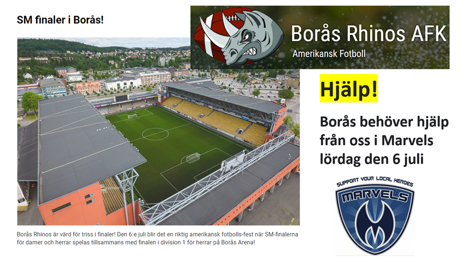 Hjälp! Borås behöver hjälp från oss i Marvels lördag den 6 juli Hej! Borås Rhinos behöver alla Marvels för att hjälpa till med SM finalen. Det är kris med planeringen inför SM och vi ska naturligtvis göra allt vad vi kan för att vara behjälpliga. Borås behöver 50 st. personer (spelare, coacher, lagledare, föräldrar, syskon) mm som arbetar olika pass under dagen. Förmodligen blir det 4-timmars pass. Vi får veta mera i slutet av veckan eller i helgen. De frågar specifikt efter visiteringspersoner, entrépersonal, funktionär, publikvärdar och vakter osv… så U17, U19, herrar och damer är varmt välkomna till att anmäla sig i kallelsen här på Laget.se. U13 och U15 har också fått denna förfrågan, jag är så säker på att de som kan och vill vara med hjälper till, så ta med större syskon och föräldrar. Anmäl dig i kallelsen här på Laget.se. Borås bjuder självklart alla som är med och hjälper till på funktionärslunch, kaffe, dricka, vatten, bulle. Mer information, se länk till Borås Rhonos SAFFs hemsida, se länk Mvh/ Douglas Smith Ledamot
