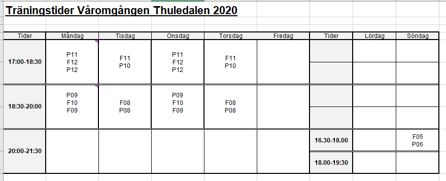 Tjena! Här kommer tiderna för träning på Thuledalen. När vi får flytta "in" från grus bestämms av planansvariga. Som vanligt kan ni ställa frågor eller "rätta mig" om ni hittar konstigheter. Kontakta mig via mail / telefon eller skriv en kommentar. Kom ihåg att match går före träning, hjälp varandra genom god kontakt om ni upptäcker krockar. Alla ska ha fått träningsdagar efter sitt önskemål. //Per