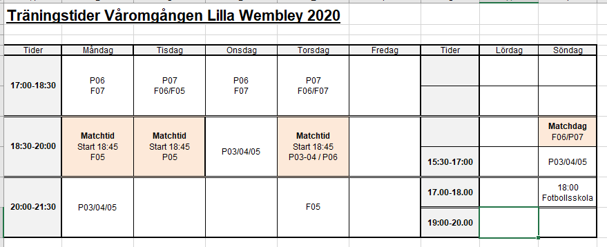 Tjena! Här kommer tiderna för träning på Lilla Wembley. När vi får flytta "in" från grus bestämms av planansvariga. Som vanligt kan ni ställa frågor eller "rätta mig" om ni hittar konstigheter. Kontakta mig via mail / telefon eller skriv en kommentar. Kom ihåg att match går före träning, hjälp varandra genom god kontakt om ni upptäcker krockar. Alla ska ha fått träningsdagar efter sitt önskemål. PS F05 och P06 har även en tid på söndagar på Thuledalen. (Tiden går att justera alt att flytta till Lilla Wembley) DS //Per