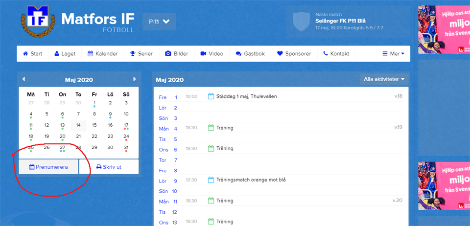 Vill man ha P11'as aktiviteter i sin kalender på telefon eller dator så kan man aktivera det genom aatt välja prenumerera, under kalendern på laget-sidan. Då får man även nya och ändrade aktiviteter direkt i sin egen kalender. Bilden är från dator, men ser ut att gå att göra likadant från laget.se-appen på telefon också.