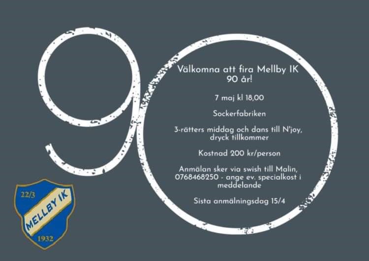 Välkomna att fira Mellby IK 90 år! 7 maj kl; 18,00 Sockerfabriken 3-rätters middag och dans till N´joy, dryck tillkommer. Kostnad 200 kr/person Anmälan sker via swish till Malin, 0768468250, ange ev specialkost i meddelande. Sista anmälningsdag 15/4 P10 11 feb 2022 0kommentarer