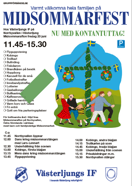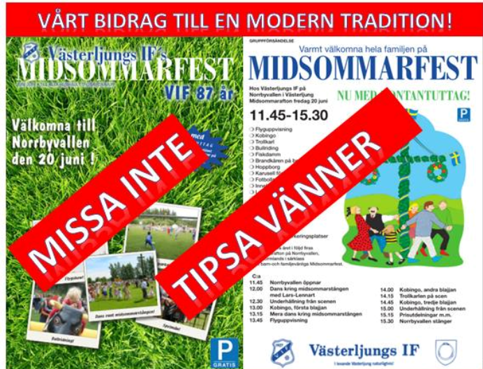 Välkommen till årets midsommarfest som börjar 11:45 midsommarafton! Artikel i lokaltidningen om VÃsterljung IFs årliga midsommarfest: "Östra Sörmlands i särklass barn- och familjevänligaste midsommarfest!". Klicka här för att komma till artikel