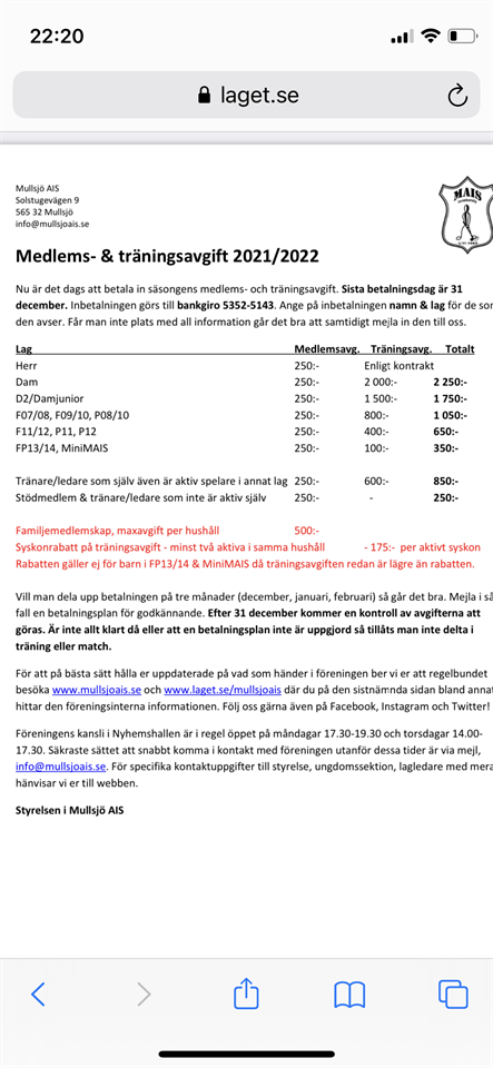 Hej! Har missat att skicka ut denna! Den kom sent och sista betalningsdag är ju förbi men betala när ni kan. Ni som betalade in förra säsongen innan vi fick bryta träningarna kan höra av er till mig för vidare information. Har ni frågor är ni välkomna att höra av er till mig. Träning Lördag 15/1 9.00-10.00 OBS! Söndag 23/1 9.00-10.00 Hälsningar Maja MiniMais 12 jan 2022 0kommentarer