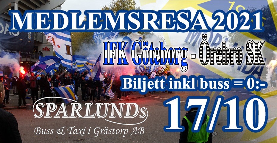 MEDLEMSRESA 2021! Den 17/10 bjuder vi på resa till Gamla Ullevi för att titta på IFK Göteborg - Örebro SK. Föreningen står för både matchbiljett och bussresa för våra medlemmar. Alla som är medlemmar i Morlanda GoIF för året 2021 är välkomna att åka med. Man är medlem om man har betalat något av följande medlemskap: Aktiv medlem 500kr Familjemedlem 900kr (då är alla på samma adress som betalaren medlemmar) Stödmedlem 200kr Vi har ett begränsat antal platser så anmäl er i tid.Sista anmälningsdag är 11/10. BOKA HÄR! Ugefärliga hålltider för dagen: Avresa Glimmaråsen: 15:00 Ankomst Gamla Ullevi: 16:00 Matchstart: 17:30 Hemresa från Gamla Ullevi: 20:00 Tillbaka på Glimmaråsen: 21:00 Exakta tider meddelas under veckan innan resan när anälningarna är bekräftade. Eventuella överskottsbiljetter kommer att släppas under veckan innan. Hoppas vi kan fylla alla platserna! Morlanda GoIF 23 sep 2021 0kommentarer