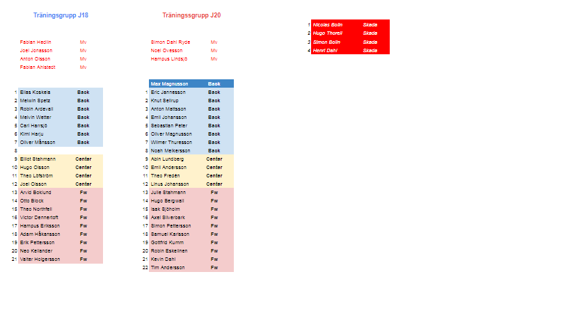 Laget: Simon Dahl Ryde, Noel Ovesson Albin Lundberg, Axel Silverbark, Emil Andersson, Emil Johansson, Eric Jannesson, Hugo Bergvall, Isaac Sjöholm, Julius Stahmann, Max Magnusson, Simon Pettersson, Tim Andersson, Robin Eskelinen, Sebastian Peter, Oliver Magnusson, Theo Fredén, Valter Holgersson, Oliver Månsson, Bemanning. Online: Noel Ovesson Speaker/musik: Eric Jannesson Klocka: Emil Andersson Skott/bås: Julius Stahmann, Albin Lundberg Svensk Hockey TV: Timmi Kiosk Tim Andersson, Theo Fredén Klockan skall startas men nedräkning 1timme innan match. Musik skall vara på plats o igång under värmning Dom som har skott/bås måste fixa målen efter spolning innan värmning och under match Online görs enligt rutin i Tsm Detta är spelarnas o vaktmästarens krav //Annika