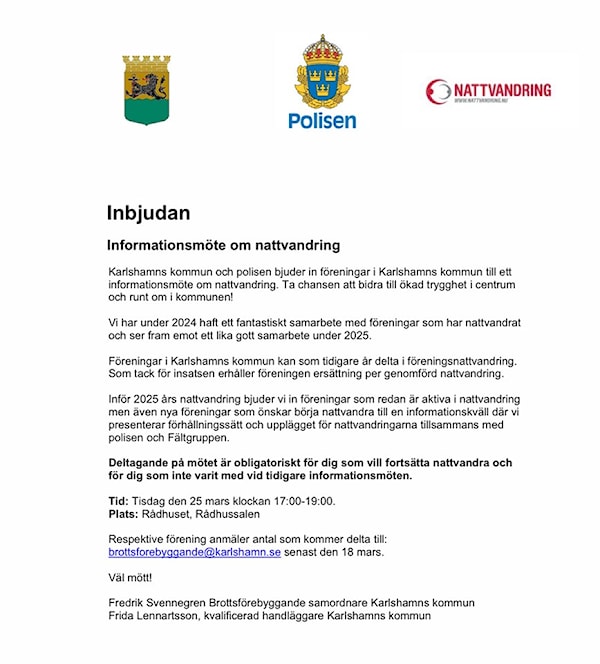 Info om utbildningskväll för nattvandrare på bilden. Kommer mer info imon om alla behöver gå eller bara dem som inte gått tidigare.